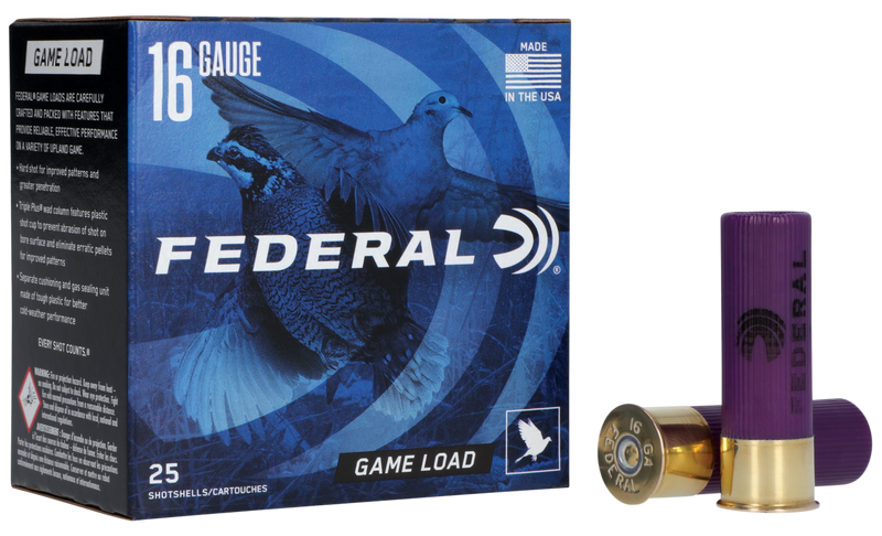 Federal Game-Shok shotshells in 16 gauge with 2.75" plastic casings deliver 1 ounce of #8 lead shot at 1165 fps muzzle velocity. Designed for upland game hunting and clay target shooting. Each box contains 25 rounds.