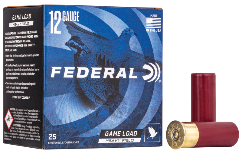 Federal Game-Shok Heavy Field Load in 12 gauge 2.75" shells with 1 1/8 oz of #8 lead shot at 1255 fps muzzle velocity. Designed for upland game hunting including dove, pheasant, quail, rabbits, and squirrels with uniform lead shot for consistent patterns. Plastic casing with Federal primers for reliable ignition in various conditions.