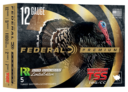 Federal Heavyweight TSS shotshells are premium turkey hunting ammunition designed for 410 gauge shotguns with 3" chambers. Each round contains 13/16 oz of Tungsten Super Shot #7 pellets loaded to 1100 fps, delivering superior density and energy for extended-range turkey hunting with improved pattern density and consistency.