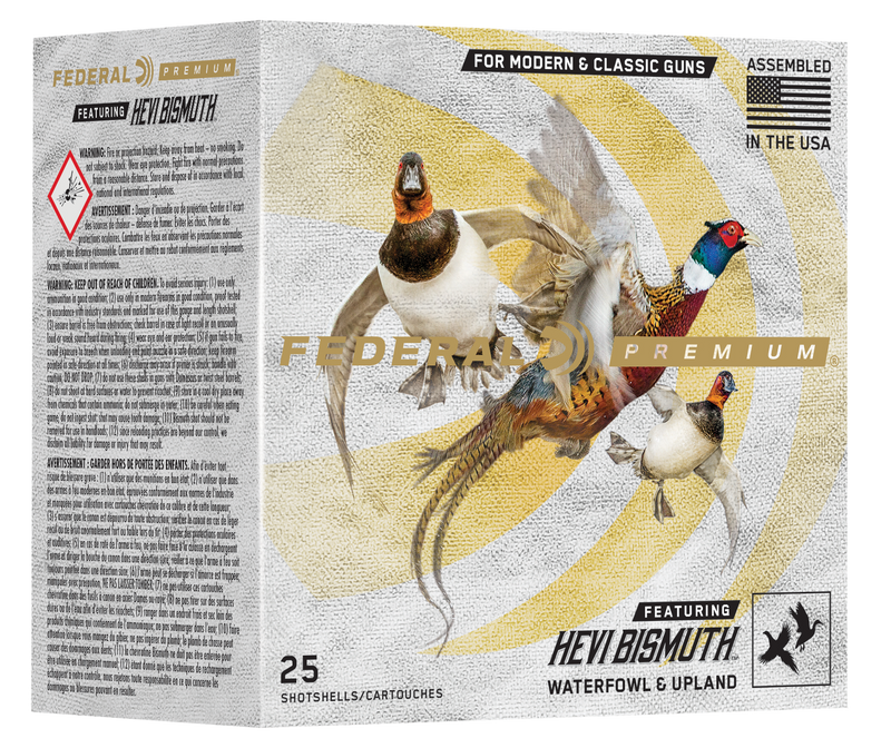 Federal Premium HEVI-Bismuth shotshells in 12 gauge deliver non-toxic bismuth pellets at 1450 fps for hunting upland birds and waterfowl. The bismuth shot is 22 percent denser than steel, providing improved pattern consistency and lethal energy downrange. These plastic-cased shells feature FLITECONTROL FLEX wad technology and are safe for both modern and classic shotguns.