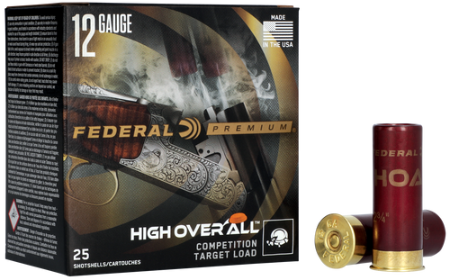 Federal Premium High Over All shotshells in 12 gauge 2.75" with 1 oz of #8 lead shot deliver 1290 fps velocity for competitive trap, skeet, and sporting clays shooting. These shells feature hard high-antimony lead pellets, an exclusive one-piece Podium wad for consistent patterns, and a solid brass head with tapered hull designed for easier reloading.