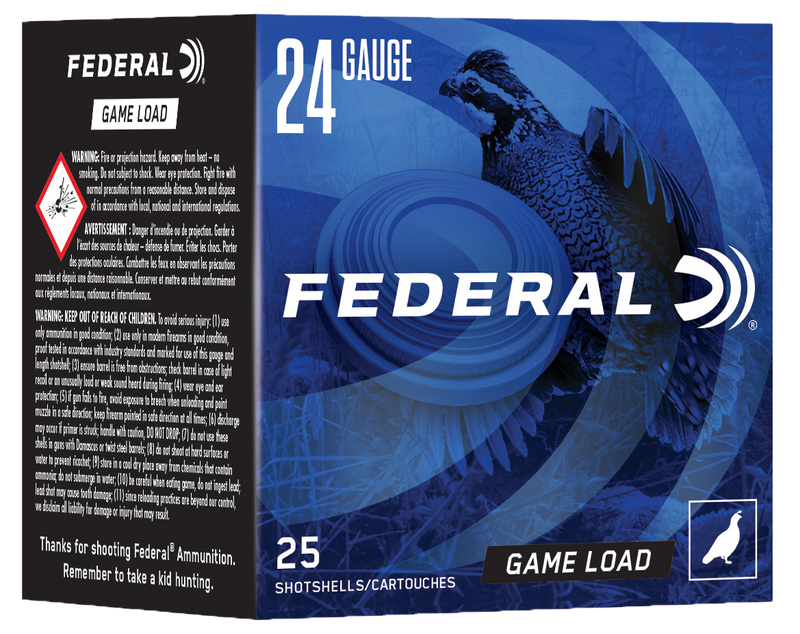 Federal Game-Shok Heavy Field shotshells in 24 Gauge deliver 11/16 oz of #8 lead shot at 1280 fps, designed for hunting upland game in woods or fields. The brass-plated steel head and one-piece wad maximize payload efficiency, while high-quality round shot is formulated for optimum hardness and improved pattern efficiency. Non-corrosive primers and select propellant ensure reliable ignition.
