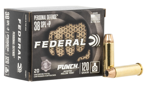 Federal Punch Personal Defense ammunition in .380 ACP features 85-grain jacketed hollow-point bullets designed for reliable expansion and penetration in self-defense applications. Loaded with nickel-plated brass cases and sealed primers for consistent feeding and ignition. Muzzle velocity is 1000 fps with 189 ft-lbs of energy.