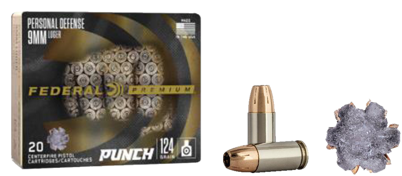 Federal Punch Personal Defense 9mm Luger ammunition features 124-grain Jacketed Hollow Point bullets with a muzzle velocity of 1150 fps and muzzle energy of 364 ft-lbs. The skived jacket and soft lead core design produces balanced expansion and penetration, while nickel-plated brass casings with sealed primers ensure reliable feeding and ignition for defensive applications.