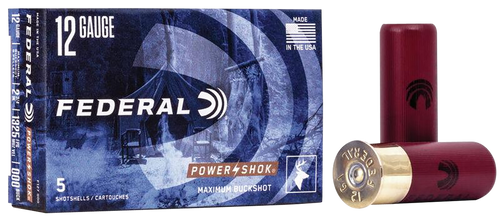 Federal Power-Shok Buckshot is a 12 gauge 2.75" magnum load containing 27 pellets of #4 buck shot, delivering 1325 fps muzzle velocity with a maximum dram equivalent. Designed for hunting medium game, these rounds feature a Triple Plus wad system and granulated plastic buffers to maintain uniform shot pellet shape and tighter patterns. Packaged in plastic cases with 5 rounds per box and 50 boxes per case.