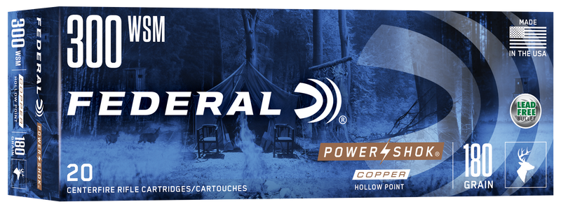 Federal Power-Shok 300 WSM centerfire rifle ammunition features 180-grain jacketed soft point bullets designed for hunting and target shooting. This ammunition delivers 2980 fps muzzle velocity and 3549 ft-lbs of energy with brass casings. Sold in boxes of 20 rounds with 10 boxes per case.