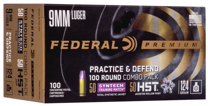 Federal Premium Practice & Defend combines 50 rounds of HST Personal Defense hollow point loads with 50 rounds of Syntech Training Match rounds, all in 9mm Luger 124gr. Both loads produce identical velocities of 1150 fps and trajectories for realistic training and reliable self-defense performance.