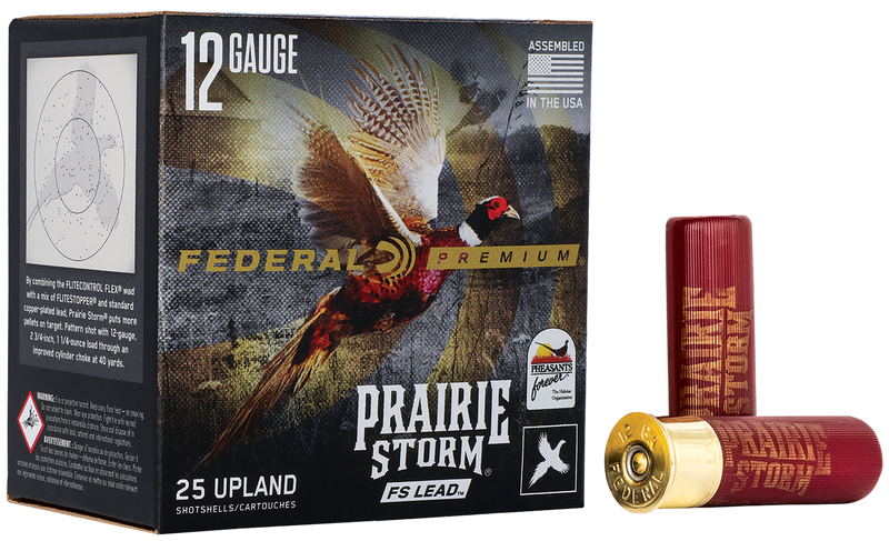 Federal Premium Prairie Storm FS is a 12 gauge 3" shotshell loaded with 1-5/8oz of lead shot (#4) at 1350 fps, designed for upland hunting. The load features a FLITECONTROL wad and a mixed payload of standard copper-plated pellets and FLITESTOPPER lead for consistent edge-to-edge patterns and increased lethality. Plastic cased ammunition comes 25 rounds per box.