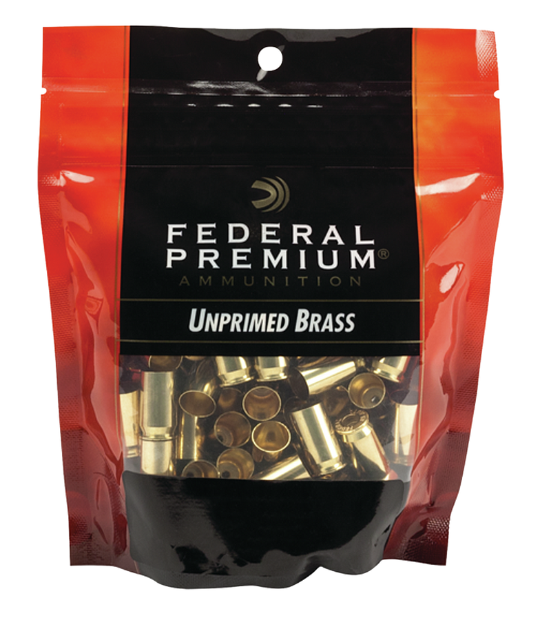 Federal Premium unprimed brass handgun cartridge cases designed for reloading .45 ACP ammunition. These corrosion-resistant brass cases can withstand high pressures and are reloadable multiple times. Quantity of 100 cases per bag.