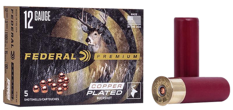 Federal Premium Vital-Shok buckshot in 12 gauge 3" shells with 15 copper-plated 00 buck pellets per round, loaded to 1100 fps muzzle velocity. Designed for hunting applications including predators, hogs, and deer, these shells feature buffered copper-plated shot for tight patterns and consistent downrange energy.