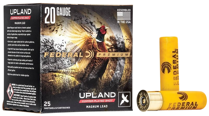 Federal Premium Wing-Shok Magnum shotshells in 20 gauge 3" magnum length deliver 1 1/4 oz of copper-plated lead shot at 1300 fps muzzle velocity, designed for hunting applications. The super-hard copper-plated shot and heavy payload produce tighter patterns and deeper penetration at longer distances. Shot padding reduces deformation and supports consistent performance.