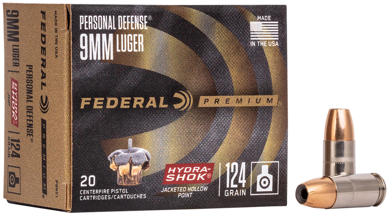 Federal Premium Personal Defense 9mm Luger 124gr Hydra-Shok JHP Handgun Ammunition - P9HS1