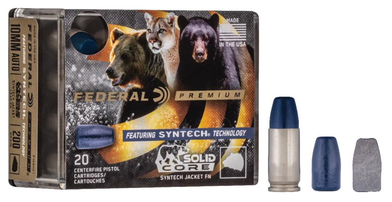 Federal Premium Solid Core 10mm Auto ammunition features a 200-grain flat-nose bullet with a Syntech polymer jacket that reduces friction and leading while maintaining deep penetration through bone. This round achieves 1200 fps muzzle velocity and 639 ft-lbs of energy, making it suitable for hunting and dangerous animal defense applications. The nickel-plated brass casing is reloadable and comes in boxes of 20 rounds.