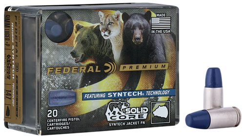 Federal Premium Solid Core handgun ammunition in 45 ACP+P with 240gr flat-nose bullets delivers 1000 fps muzzle velocity and 533 ft-lbs of energy. The Syntech polymer jacket reduces leading while the solid core construction provides high weight retention and deep penetration for hunting and personal defense applications.