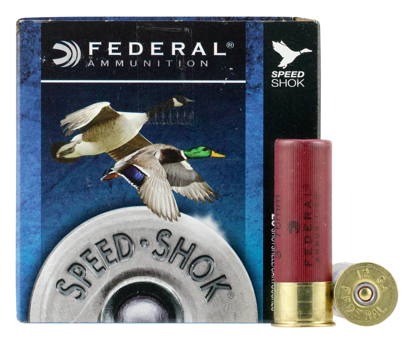 Federal Speed-Shok High Velocity steel shotshells in 12 gauge, 3" chamber, loaded with 1 1/4 oz of #1 steel shot at 1450 fps. Designed for waterfowl hunting, these steel loads feature a Catalyst lead-free primer and fast-burning powder that reduces residue while delivering clean, effective patterns on ducks and geese.