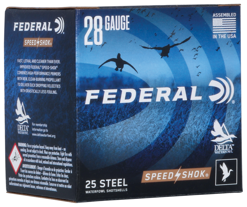 Federal Speed-Shok High Velocity Steel shotshells in 28 gauge 2.75" with #6 shot and 5/8 oz load. These steel shot rounds are designed for waterfowl hunting with a muzzle velocity of 1350 fps. Packaged in 25-round boxes with 10 boxes per case.