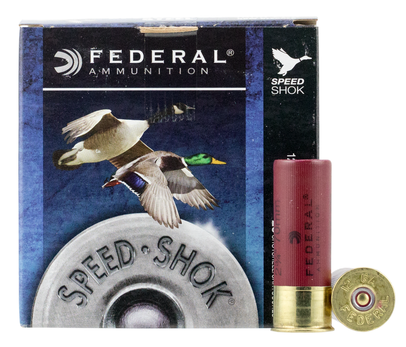 Federal Speed-Shok is a high-velocity waterfowl shotshell loaded with steel shot in 12 gauge, 2.75" cases at 1500 fps. The redesigned load features a fast-burning clean propellant and high-performance primer to reduce residue while delivering effective performance on ducks and geese. Steel shot with #3 pellet size provides extended range for waterfowl hunting.