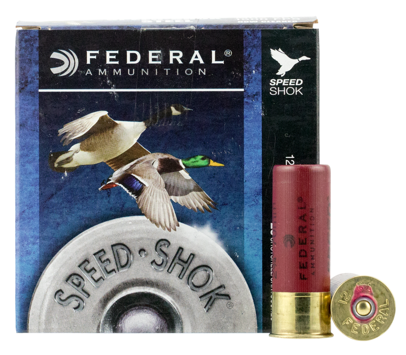 Federal Speed-Shok is a high-velocity steel shotshell designed for waterfowl hunting, featuring a fast-burning clean propellant that reduces barrel residue and a high-performance primer for consistent ignition. The load delivers 1500 fps velocity with 1 1/8 oz of #6 steel shot in a 2.75" plastic casing, optimized for knocking down ducks and geese at distance.