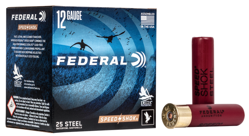 Federal Speed-Shok is a steel shot waterfowl hunting load in 12 gauge 3.5" shells with 1 3/8 ounces of #2 shot, delivering 1550 fps muzzle velocity. The plastic casing and lead-free steel shot construction make this ammunition California-compliant and suitable for hunting applications where non-toxic shot is required.