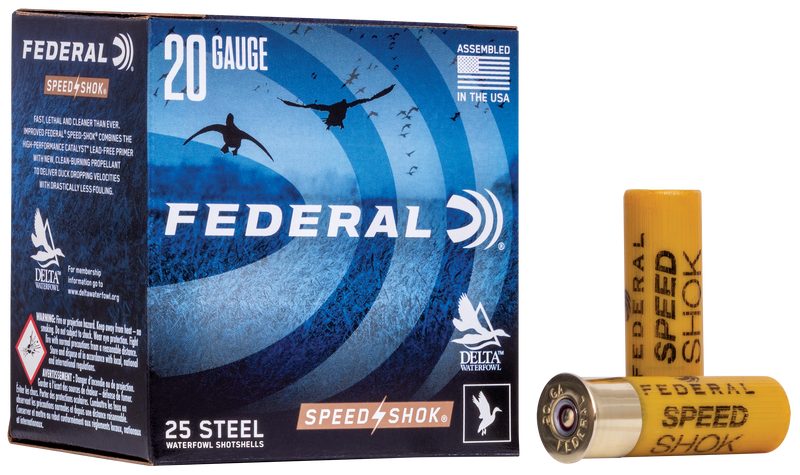 Federal Speed-Shok is a steel shotshell designed for waterfowl hunting in 20 gauge with 3/4oz #6 shot and a muzzle velocity of 1425 fps. The Catalyst lead-free primer and fast-burning powder reduce residue while delivering effective knockdown power on ducks and geese. Plastic casing with 25 rounds per box, 10 boxes per case.