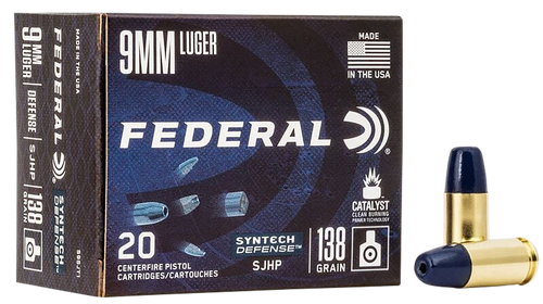 Federal Syntech Defense 40 S&W ammunition features 175-grain semi-jacketed hollow point projectiles in 50-round boxes. The hollow-point bullet design separates into three segments on impact for enhanced terminal performance, achieving 12-18 inches of penetration while creating secondary wound channels; the blue polymer jacket reduces barrel heat and fouling.