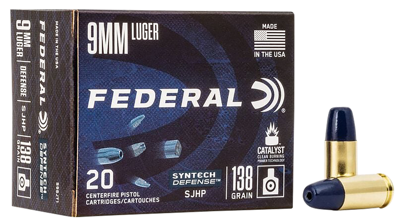 Federal Syntech Defense 9mm Luger ammunition features 138 grain semi-jacketed hollow point bullets with a polymer coating that prevents metal-on-metal bore contact, reducing fouling and extending barrel life. Loaded with clean-burning powders and a Catalyst lead-free primer, this ammunition delivers 1050 fps muzzle velocity and 338 ft-lbs energy from a standard 20-round box.