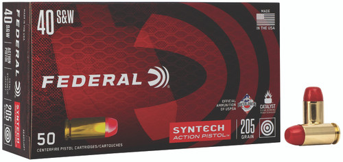 Federal AE10SJ1 Syntech Range ammunition in 10mm Auto features a 205 grain Total Syntech Jacket Flat Nose bullet design optimized for target shooting and range use. This load delivers 1150 fps muzzle velocity and 602 ft-lbs of energy with brass casing and polymer-coated bullets. Packaged 50 rounds per box with 10 boxes per case.