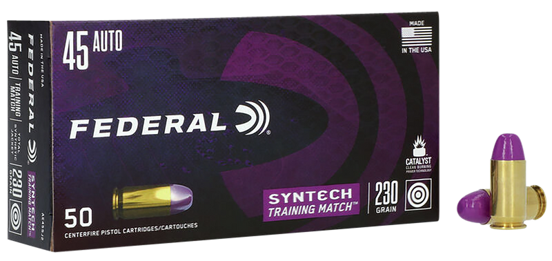 Federal American Eagle Syntech Training Match ammunition in 45 ACP with 230-grain Total Syntech Jacket (TSJ) projectiles, loaded to 890 fps muzzle velocity and 404 ft-lbs energy. The polymer jacket eliminates metal fouling and reduces barrel heat while providing the same trajectory and point of impact as Federal Premium duty ammunition. Boxer-primed brass cases are reloadable.