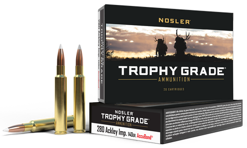 .280 Ackley Improved centerfire rifle ammunition with 140-grain Trophy Copper bullets delivering 3075 fps muzzle velocity and 2939 ft-lbs energy. Features nickel-plated brass cases, Boxer primers, and AccuChannel groove technology for improved accuracy. Sold 20 rounds per box, 10 boxes per case.