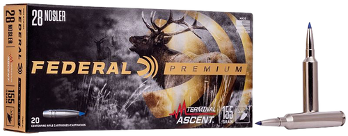 Federal Premium Terminal Ascent ammunition in 7mm Remington Magnum with 155-grain bonded bullets designed for hunting. Features a patented Slipstream polymer tip that initiates expansion at lower velocities and AccuChannel groove technology for improved accuracy and reduced drag, delivering 3000 fps muzzle velocity and 3097 ft-lbs of energy.