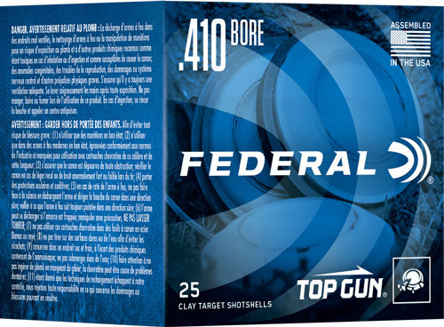 Federal Top Gun 410 gauge shotshells in 2.5" casings with 1/2 ounce #9 shot, designed for target shooting and clay sports at 1330 fps muzzle velocity. This case lot contains 250 rounds, making it ideal for high-volume shooting and practice.