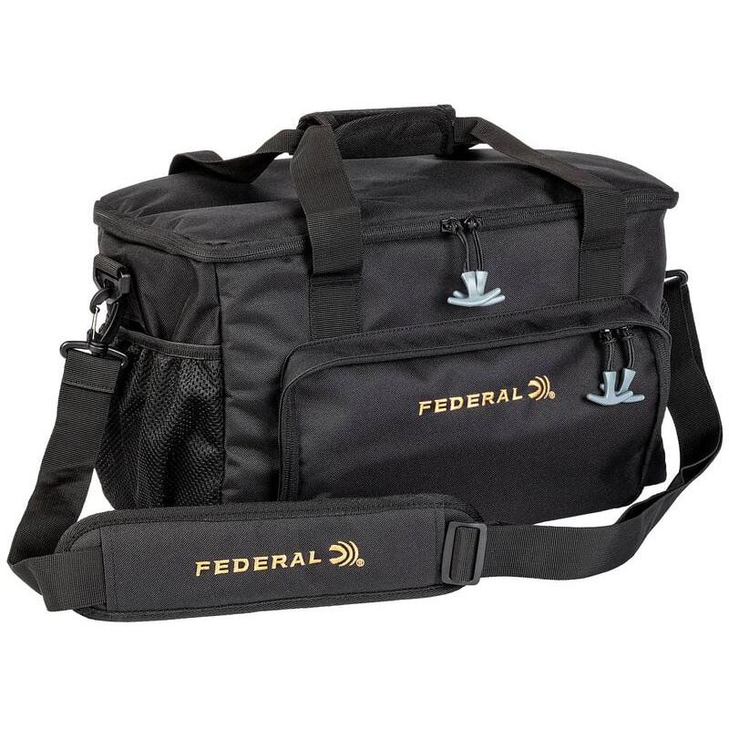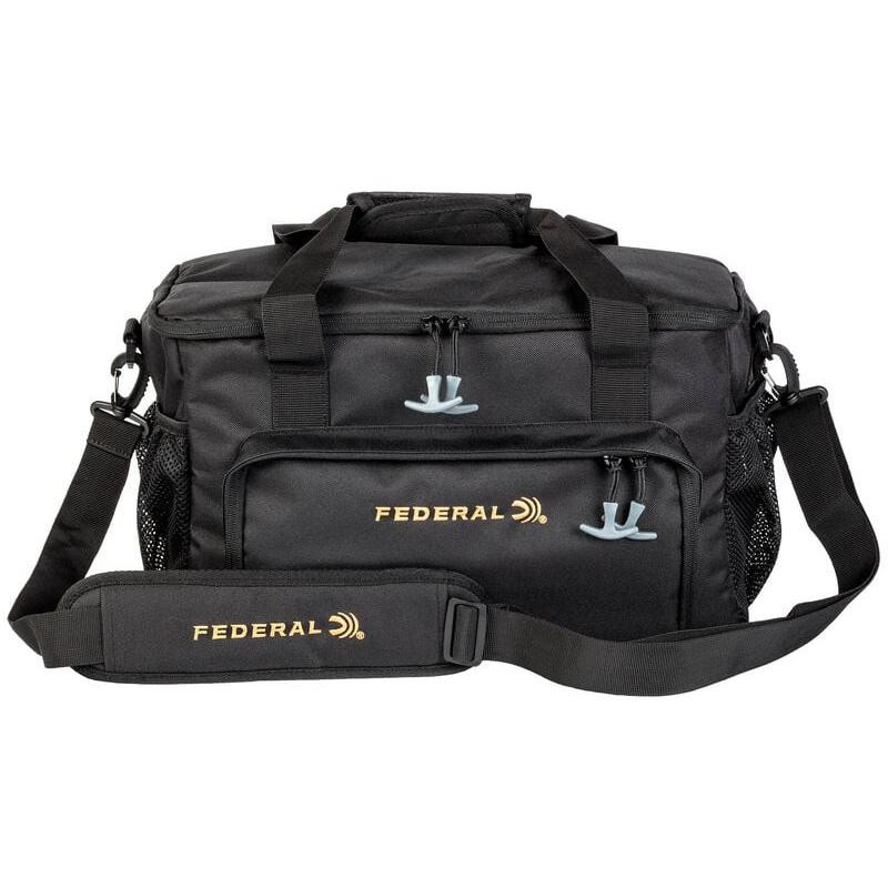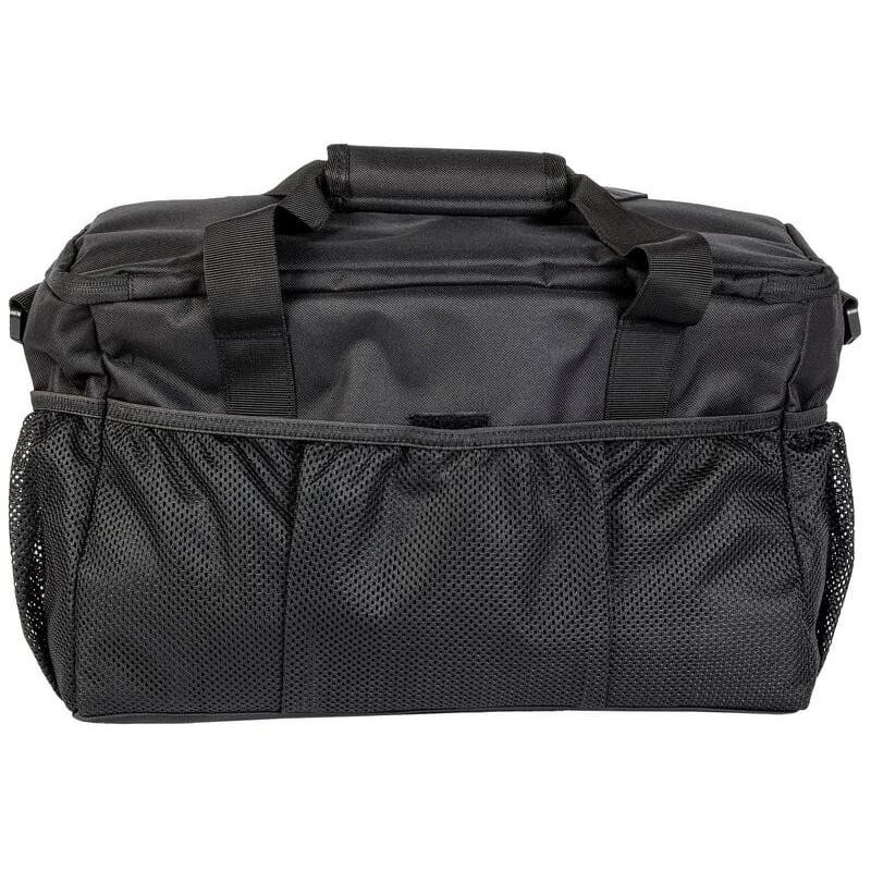 This rugged range bag measures 16"x9"x9.5" and features a three-side zippered lid with dual zipper pulls, mesh stuff pockets, and a removable internal divider for organization. All sides are padded for protection and structure, with a front zippered pouch (11"x1"x6.75") equipped with elastic loops and hook-and-loop padded handles with web straps for carry.