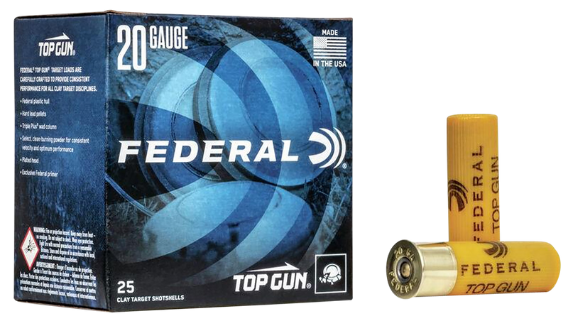 Federal Top Gun is a target-load shotshell in 20 gauge with a 2.75" plastic hull, loaded with 7/8 oz of #7.5 lead shot at 1210 fps muzzle velocity. Designed for clay target shooting and sport shooting applications, these loads feature hard shot and consistent patterns for reliable performance at the range.