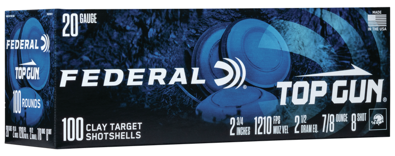 Federal Top Gun shotshells in 20 gauge 2.75" feature 7/8 ounce of hard lead shot in #8 size, designed for clay target and sport shooting applications. These loads deliver 1210 fps muzzle velocity with consistent patterns and reliable Federal primers, backed by an eight-segment crimp and unique wad column for performance. Sold in 100-round boxes with plastic casings.