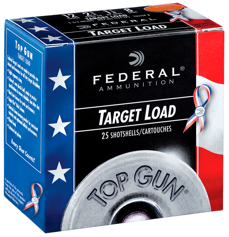 Federal Top Gun shotshells in 12 gauge 2.75" with 1 1/8 oz of #8 lead shot, designed for target and sport shooting. These shells feature plastic hulls in red, white, and blue colors and achieve a muzzle velocity of 1145 fps for consistent performance at the range. Sold 25 rounds per box.