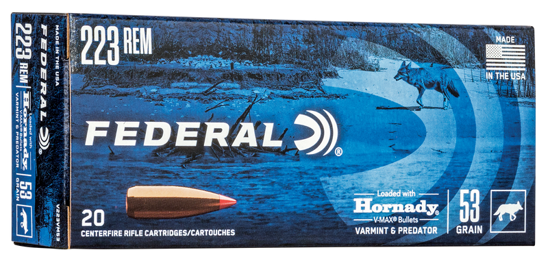 Federal Varmint & Predator ammunition in 223 Remington with 53-grain Hornady V-Max bullets delivers 3400 fps muzzle velocity and 1360 ft-lbs energy for precision varmint and predator hunting. Features boxer primers, brass cases, and reliable propellant for consistent performance. Packaged 20 rounds per box with 10 boxes per case.