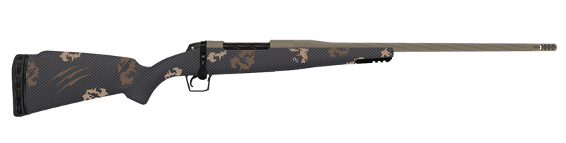 Fierce Firearms Twisted Rogue Mini in 300 Win Mag with 22" fluted threaded barrel featuring Smoked Bronze Cerakote finish and 1:10" twist rate. Bolt-action rifle built on a drilled and tapped steel receiver with a Trigger Tech Adjustable Primary ProCurve trigger, NIX Side Port Muzzle Brake, and fixed Sonora Ambush Camo carbon fiber stock with LR negative comb. Weighs 6-6.99 lbs with 3+1 round capacity.