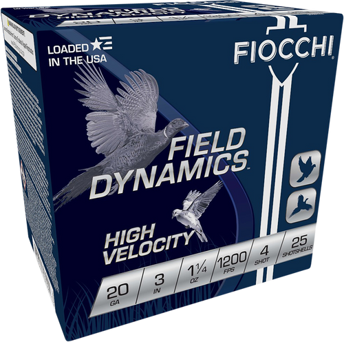 Fiocchi Field Dynamics High Velocity 12 Gauge 3" shotshells deliver 1 3/4 ounces of #4 lead shot at 1330 fps, making them well-suited for hunting upland game and waterfowl. These rounds feature a lead payload and come 25 per box with 10 boxes per case, offering reliable performance for field applications.