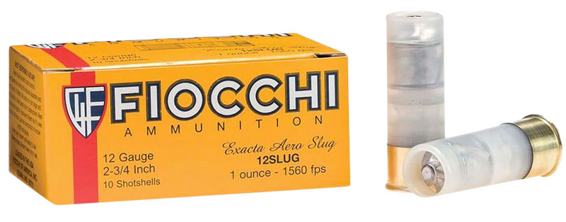 Fiocchi Aero Extrema 12 gauge shotshells deliver 1 ounce rifled slugs at 1560 fps muzzle velocity, designed for hunting and home defense applications. These 2.75" shells offer high velocity performance in a 10-round box format. Ideal for rifled barrel shotguns requiring accurate slug ammunition.