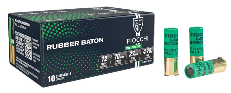 This Fiocchi 12 Gauge 2.75" shotshell features a 1oz rubber baton slug designed for home defense and less-lethal applications. The round produces 740 fps muzzle velocity and approximately 105 pounds of energy at 15-25 yards, making it suitable for deterring threats while reducing over-penetration risks.