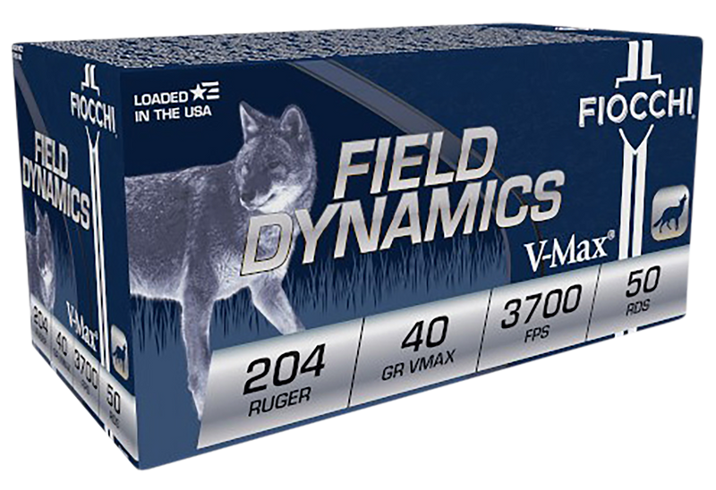 Fiocchi Field Dynamics ammunition in 204 Ruger caliber with 40-grain Hornady V-Max bullets. Features a muzzle velocity of 3700 fps and muzzle energy of 1216 ft-lbs, delivering consistent performance for hunting applications. Packaged 50 rounds per box with 20 boxes per case on brass casings.