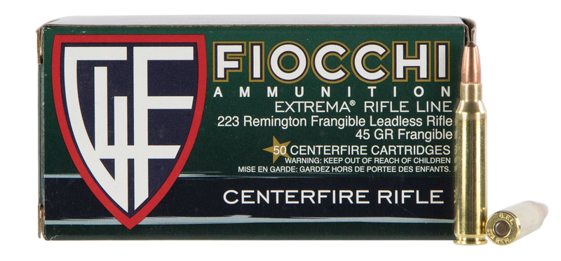 Fiocchi 223 Remington 45 grain lead-free frangible ammunition with brass casing and lead-free primers. Designed for indoor and outdoor range training with reduced ricochet and fragmentation on impact with hard targets. Muzzle velocity of 3200 fps and muzzle energy of 1023 ft lbs.