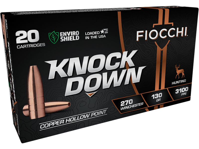 Fiocchi Knock Down Enviro Shield ammunition in 270 Winchester with 130-grain lead-free copper hollow point bullets delivering 3100 fps muzzle velocity. Packaged in boxes of 20 rounds with 10 boxes per case. Designed for hunting and sport shooting applications.