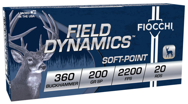 Fiocchi Field Dynamics ammunition in 360 Buckhammer caliber features a 200-grain soft point bullet designed for centerfire rifle use. This ammunition delivers a muzzle velocity of 2200 fps and is packaged with 20 rounds per box and 10 boxes per case.