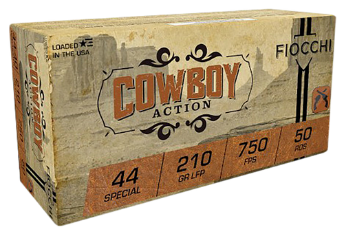 Fiocchi Cowboy Action ammunition in 38 S&W Short caliber with 145-grain lead round nose bullets. This ammunition delivers 720 fps muzzle velocity and 167 ft lbs of muzzle energy, suitable for target shooting and cowboy action competitions. Packaged in 50-round boxes with brass casings.