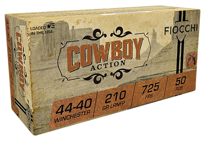 Fiocchi Cowboy Action ammunition in 44-40 Winchester features a 210-grain lead round nose flat point bullet, ideal for target shooting and cowboy action competitions. Loaded to 725 fps muzzle velocity with 245 ft-lbs of energy, delivered in boxes of 50 rounds with 10 boxes per case.