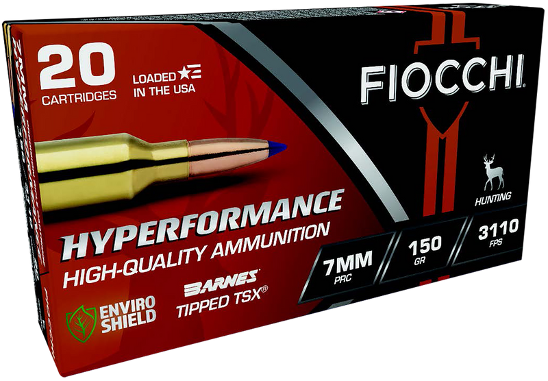 Fiocchi Hyperformance ammunition in 7mm PRC with 150-grain Barnes Tipped TSX bullets delivers 3110 fps muzzle velocity. Each box contains 20 rounds with copper casing. Designed for precision rifle hunting and target shooting applications.