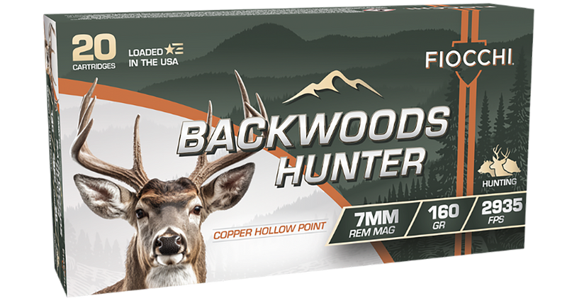 Fiocchi Backwoods Hunter ammunition in 7mm Remington Magnum with 160-grain all-copper hollow point bullets delivers 2935 fps muzzle velocity. This lead-free, reloadable brass-cased ammunition is designed for hunting applications with controlled expansion and deep penetration. Packaged 20 rounds per box with 10 boxes per case.