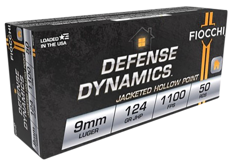 Fiocchi Defense Dynamics 9mm Luger ammunition loaded with 124-grain jacketed hollow point bullets at 1100 fps muzzle velocity. Designed for personal protection and defensive applications with brass cases. Packaged 50 rounds per box, 20 boxes per case.