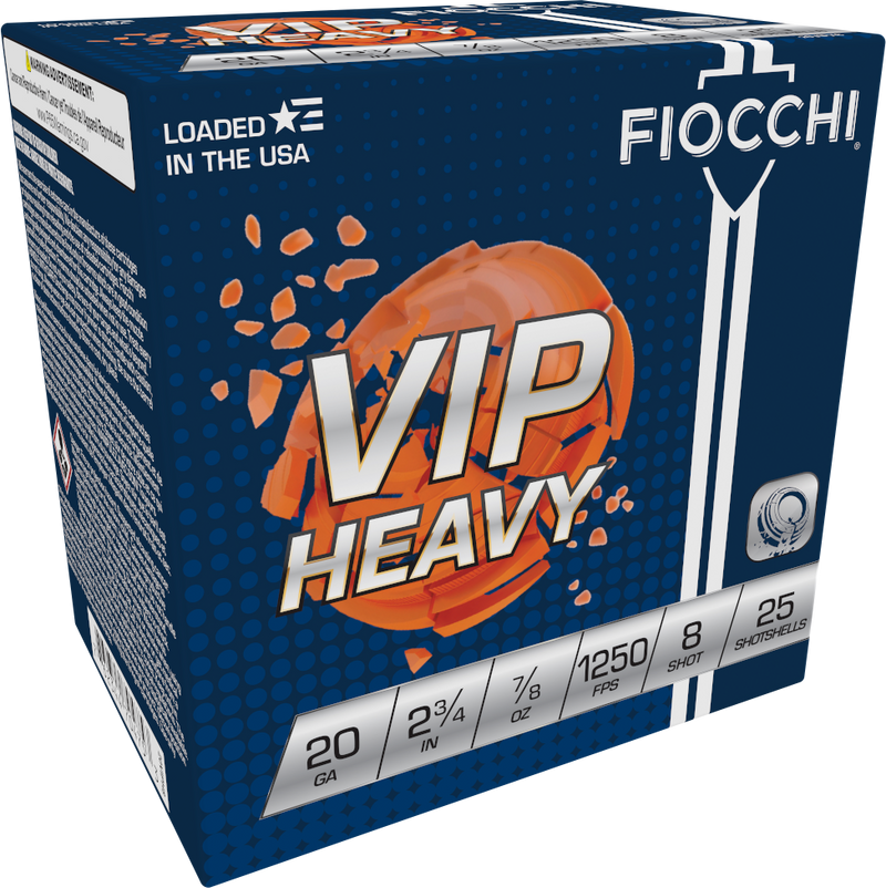 Fiocchi Exacta Target VIP Heavy shotshells in 20 gauge, 2.75" length, loaded with 7/8 ounce of #8 lead shot. These low brass plastic-cased rounds are designed for target shooting and sport clay applications, with a muzzle velocity of 1250 fps.